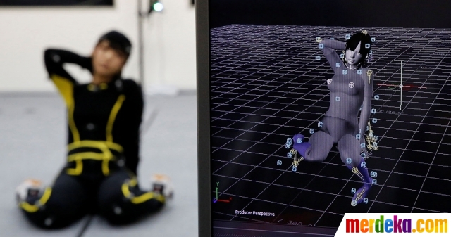Aktris Yumi Ueno mengenakan kostum dengan perangkat motion capture sebelum beradegan untuk game porno berbasis VR.